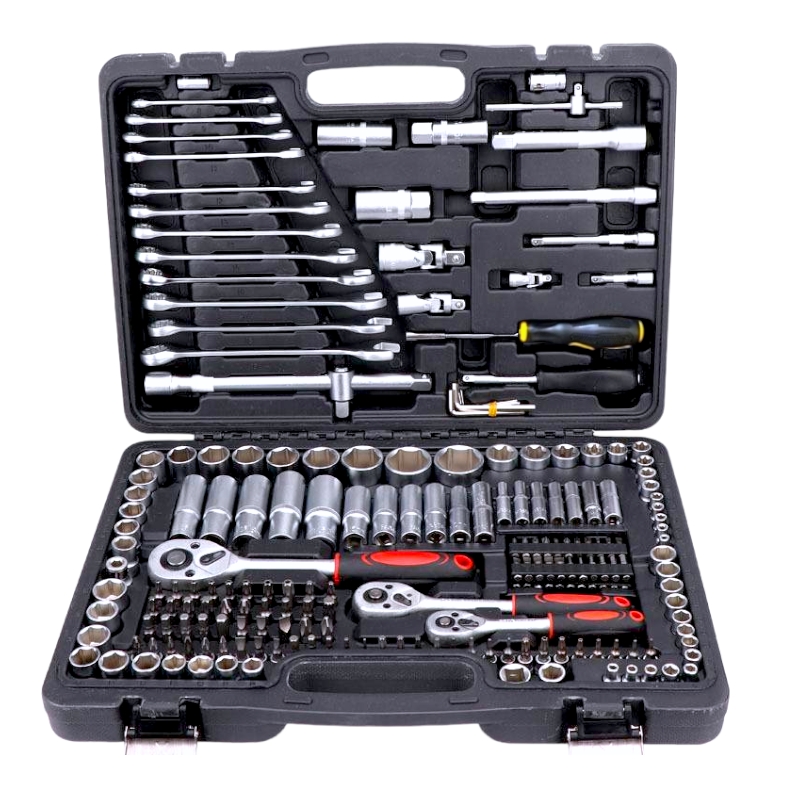 Профессиональный набор головок и ключей 216 предметов включает в себя трещотки 1/4 ,3/8 ,1/2 и представляет собой многофункциональный набор, предназначенный для ремонта и обслуживания автомобиля. Инструменты для ремонта авто выполнены из высококачественной хромованадиевой стали, что обеспечивает прочность, стойкость к коррозии и долговечность. Набор поставляется в удобном пластиковом противоударном кейсе для хранения и транспортировки.