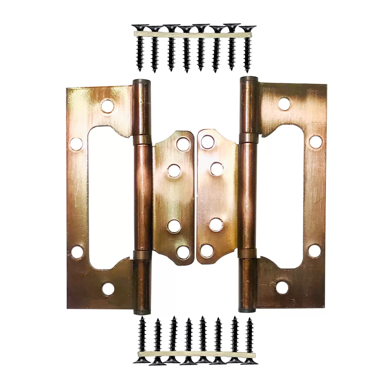 Петля универсальная без врезки 120 мм предназначена для установки деревянной двери толщиной от 20 до 60 мм. Монтаж без врезки с винтовым креплением осуществляется с помощью 16 саморезов. Круглые наконечники прямого шарнира и привлекательный цвет петель «античная бронза» в сочетании с эффектной формой делают петлю элементом декора.