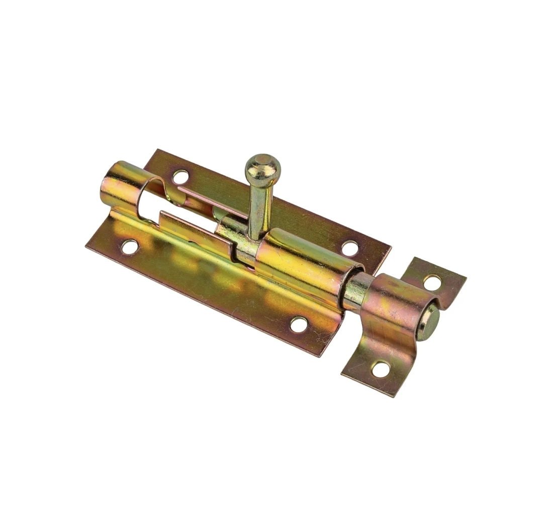 Накладной дверной шпингалет 100 мм считается самой простой и в то же время надёжной конструкцией. Задвижка-шпингалет выполнен из стали покрытый желтым цинком 38x100 мм предназначен для фиксации створок дверей в закрытом положении. Круглая ручка, зафиксированная в закрытом положении надежно препятствует случайному открытию: ход ригеля 50 мм. Число отверстий для шурупов 6.